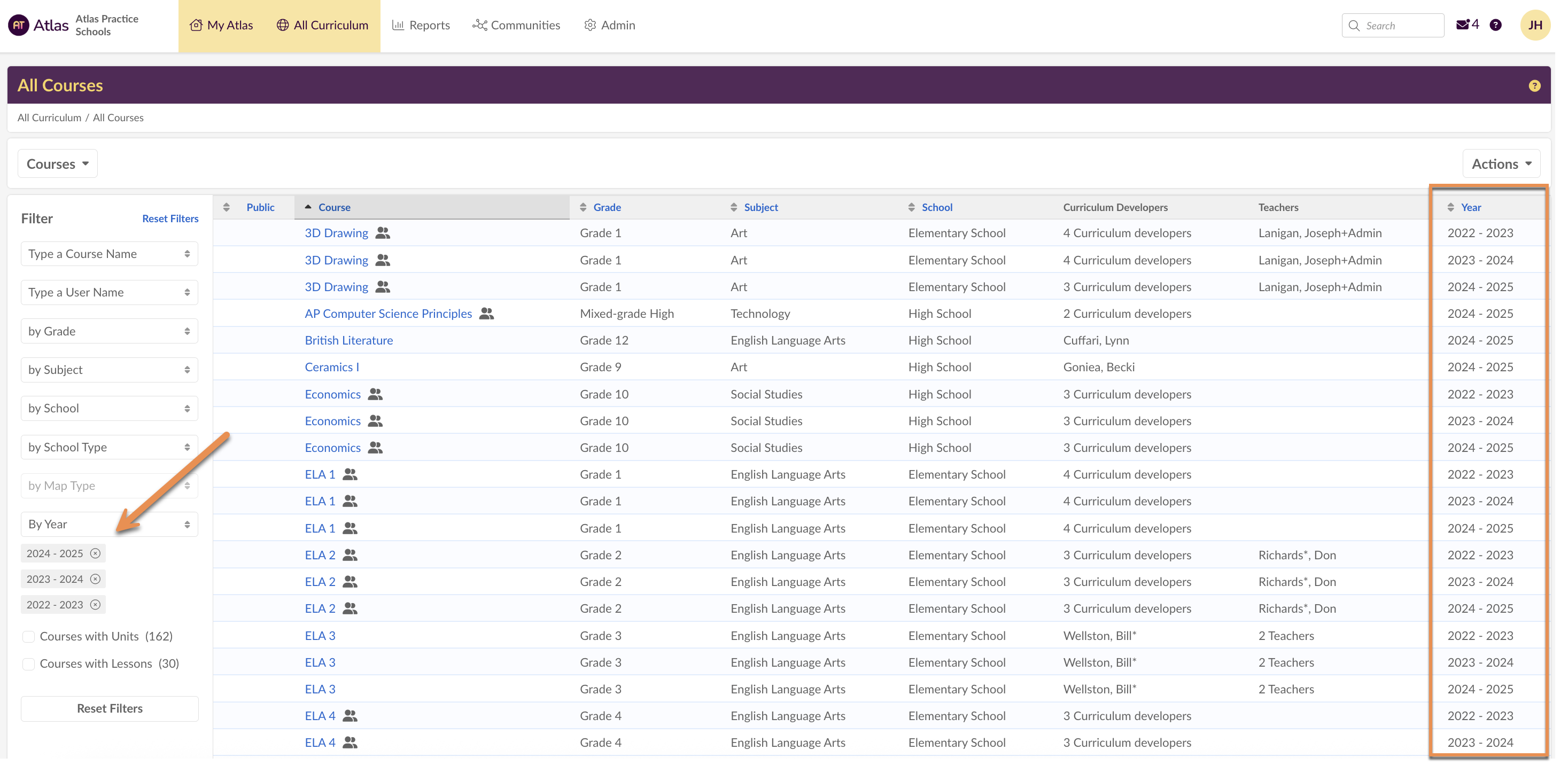 1. Filter to archived curriculum using Current Year drop-down menu.