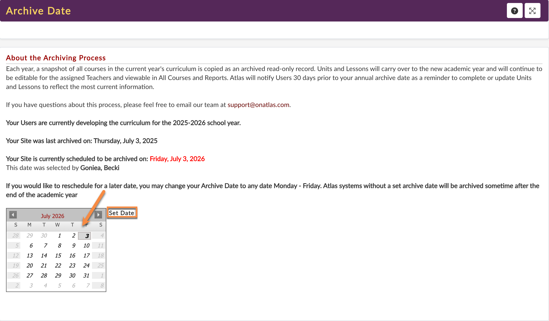 Atlas will notify users 30 days prior to your annual archive date as a reminder to complete or update curriculum maps to reflect the most current data.
