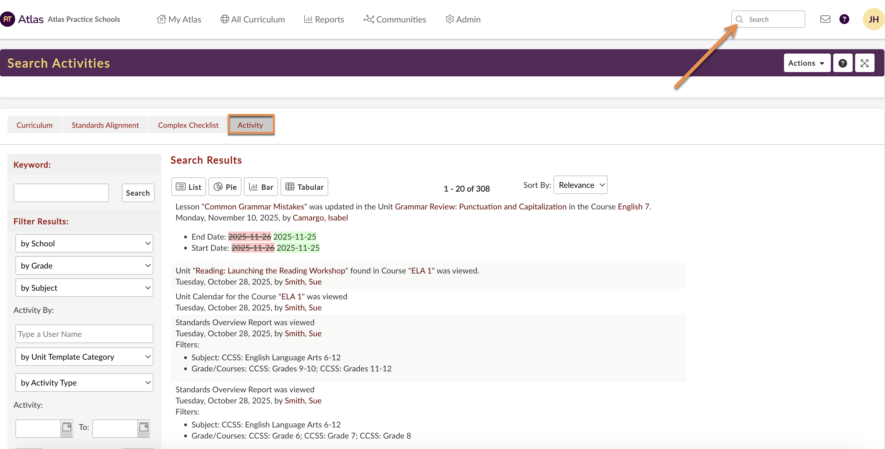 - View Curriculum: Views of any curriculum map, unit map, or calendar through All Curriculum > Browse. Views of the curriculum through My Atlas > My Courses are not recorded in the activity.