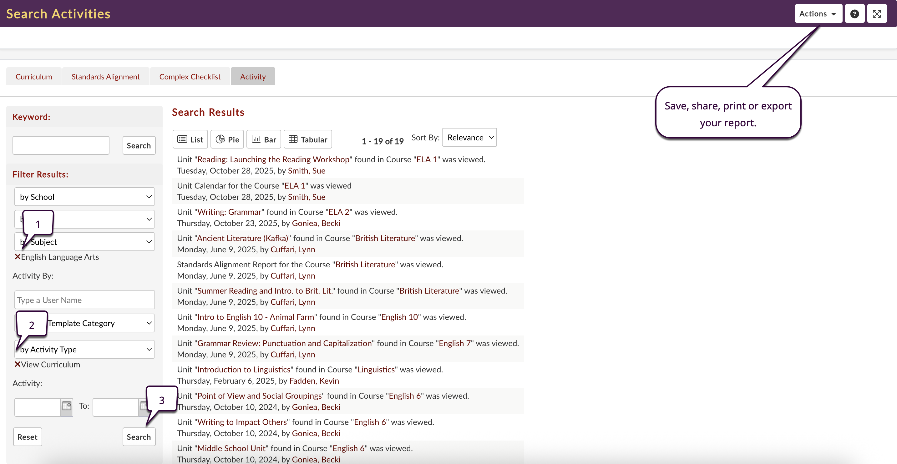 - Share Activity: Curriculum or reports that are shared with other users of the system.