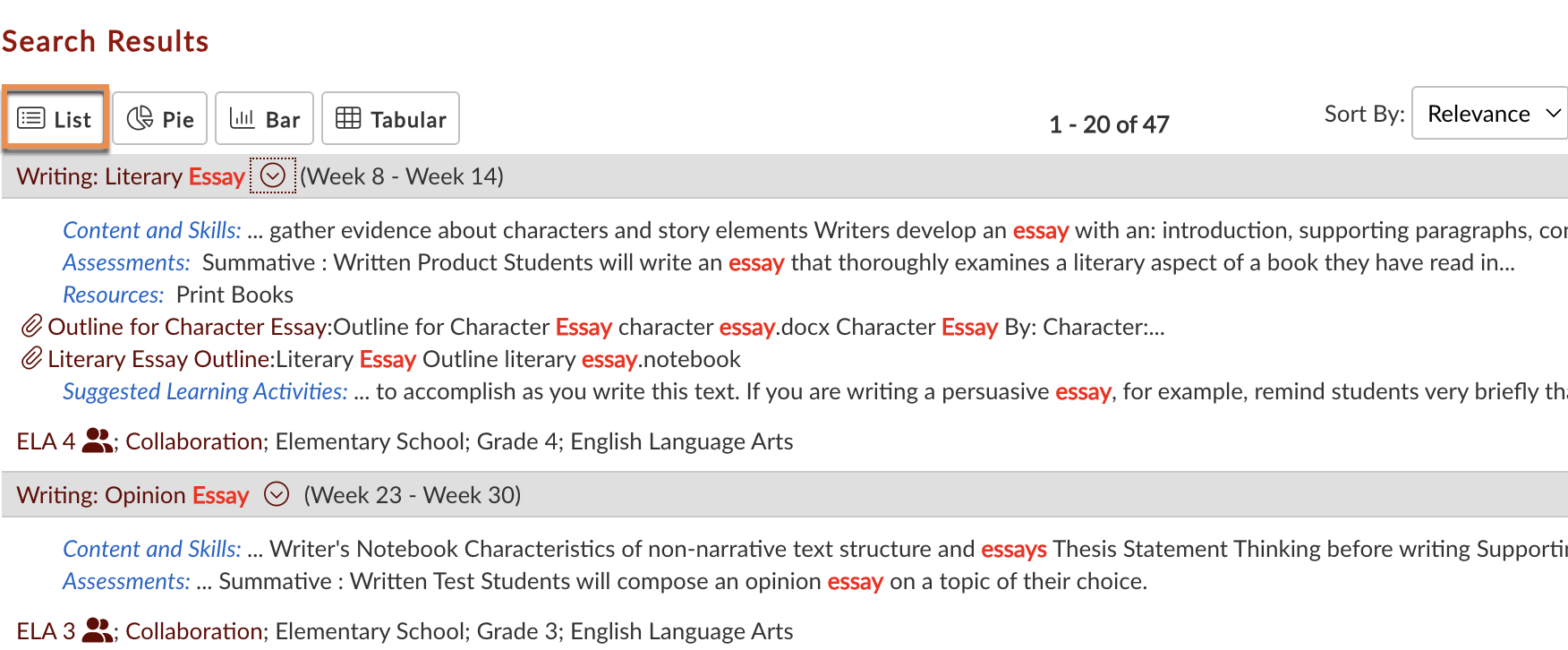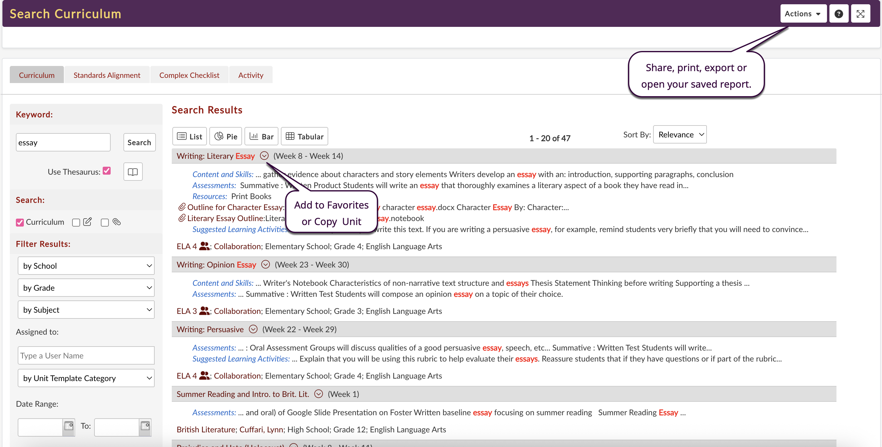 Use the Thesaurus to include related keywords and synonyms in your results. This special search tool allows you to help establish a more consistent vocabulary across your school’s curricula.