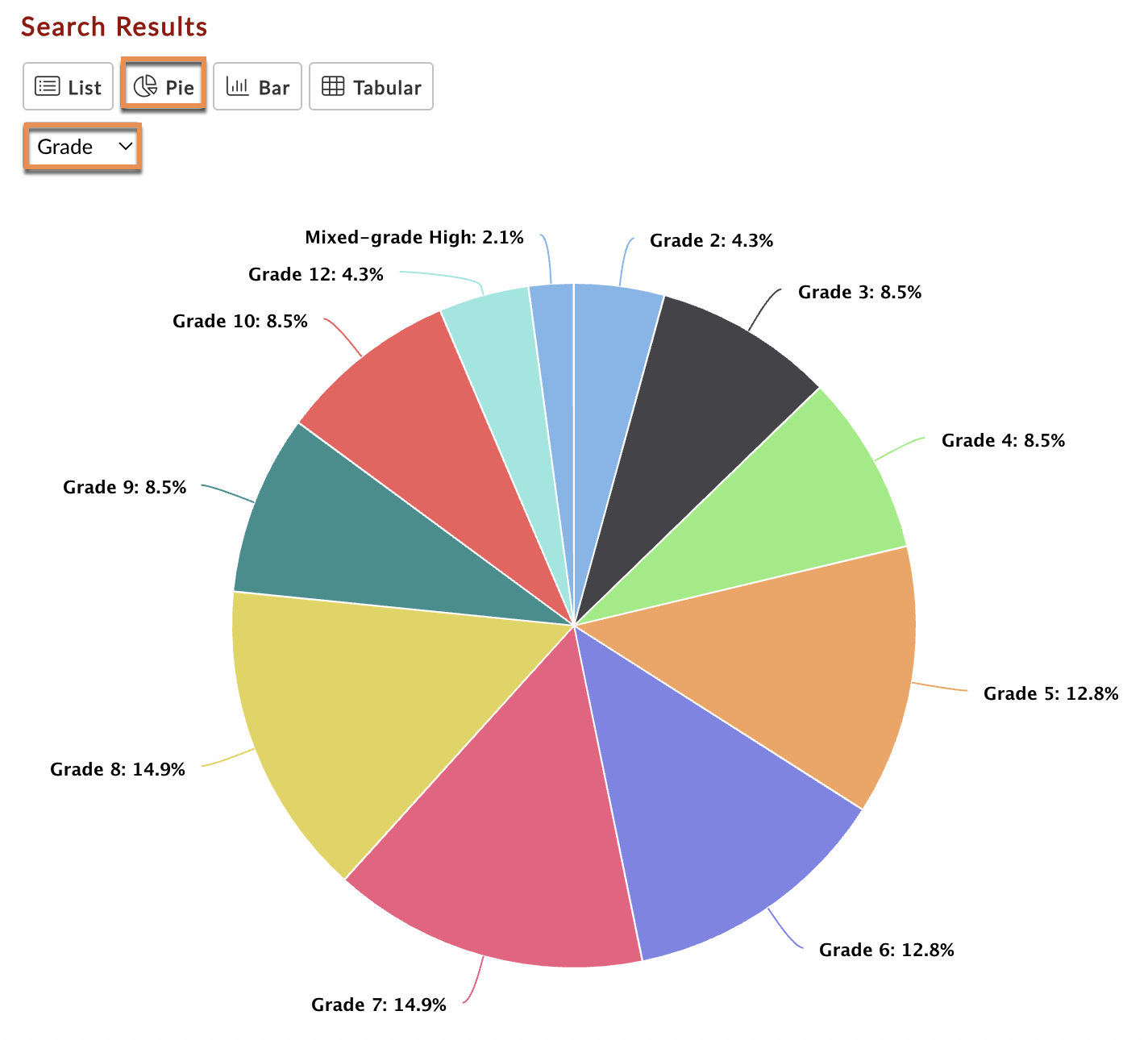 Displays results in a Pie Chart. View the chart by Subject, Grade, School, or User.