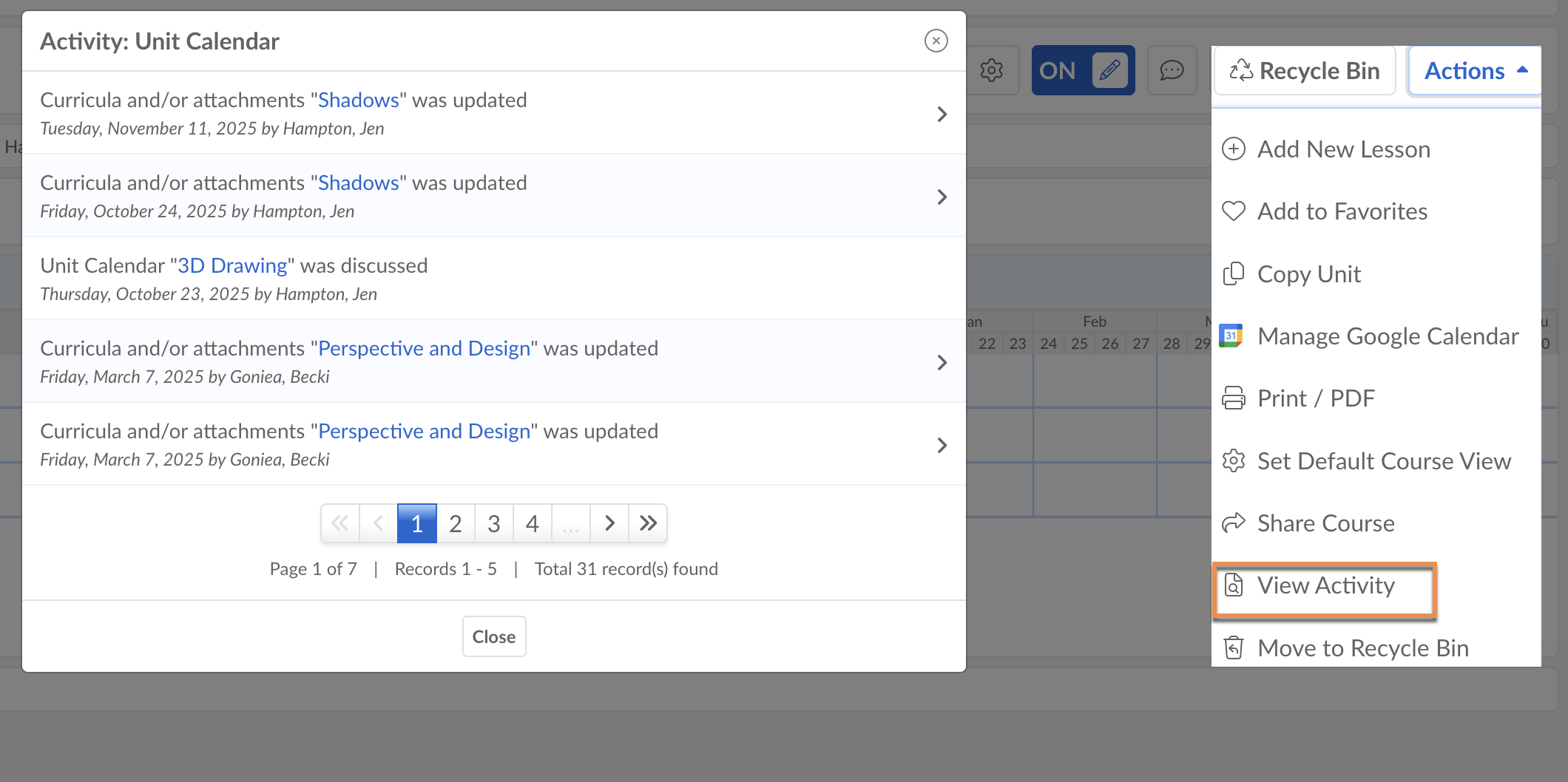 From any curriculum view, you can select View Activity from Actions to see a list of every view, edit, share, copy, or discussion on that curriculum.