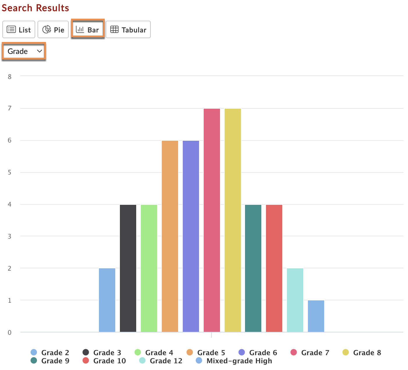 Displays results in a bar graph. View the chart by Subject, Grade, School, or User.