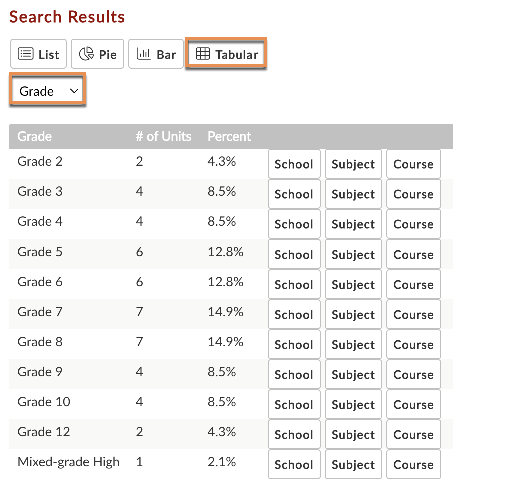Displays results as a demographic summary. View the summary by Subject, Grade, School, or User.