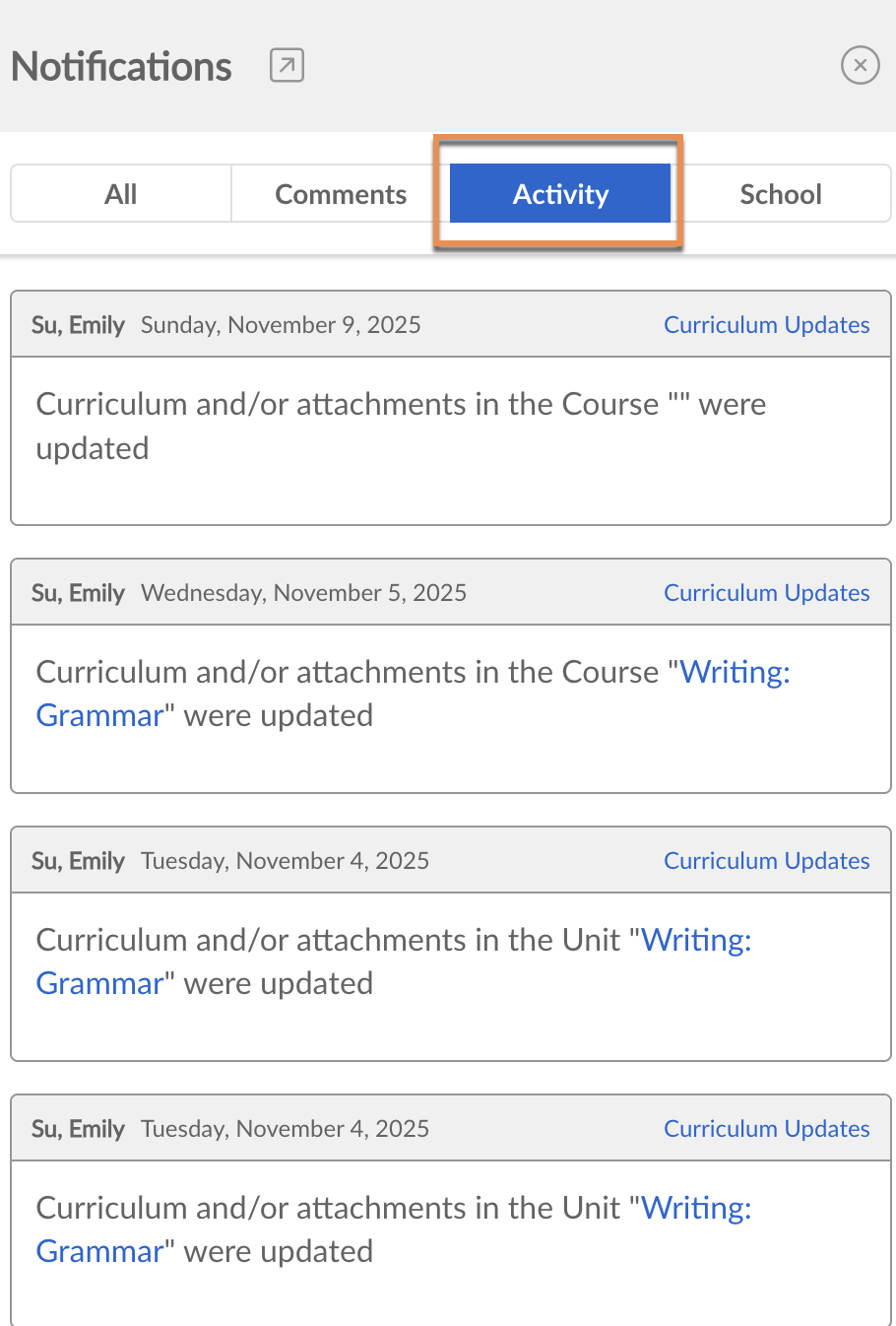 - Curriculum Updates: Changes that Curriculum Developers make to their course curriculum or unit calendar, including changes to standards, assessments, and linked resources in a course. The curriculum that is on your favorites list or copied is also recorded here.