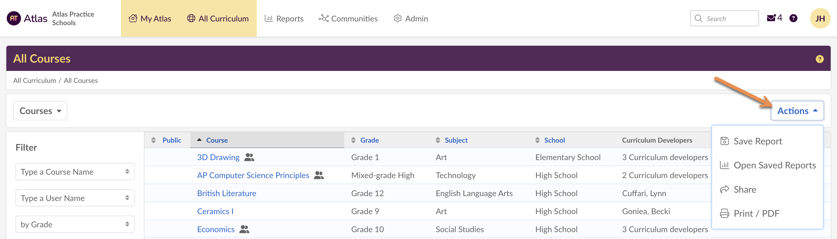 • All Curriculum: in All Courses, find specific maps in your Atlas system by using the filters to view maps by the school, grade, subject, course name, user, and by the academic year. In Adopted Standards section you can access the standards that are available in your Atlas.