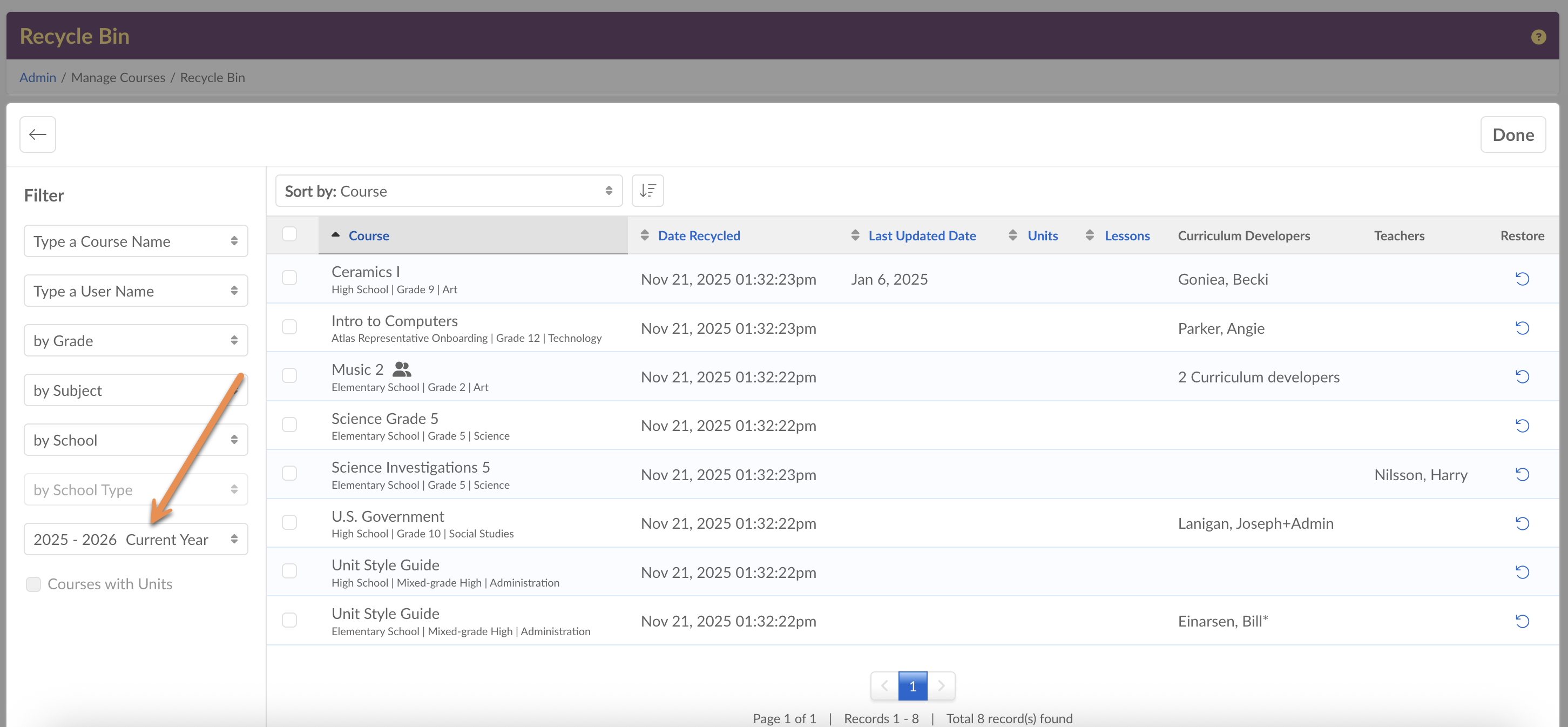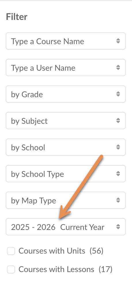 - Click the All Curriculum > All Courses tab in Atlas, then select last year’s archive in the Current Year filter.