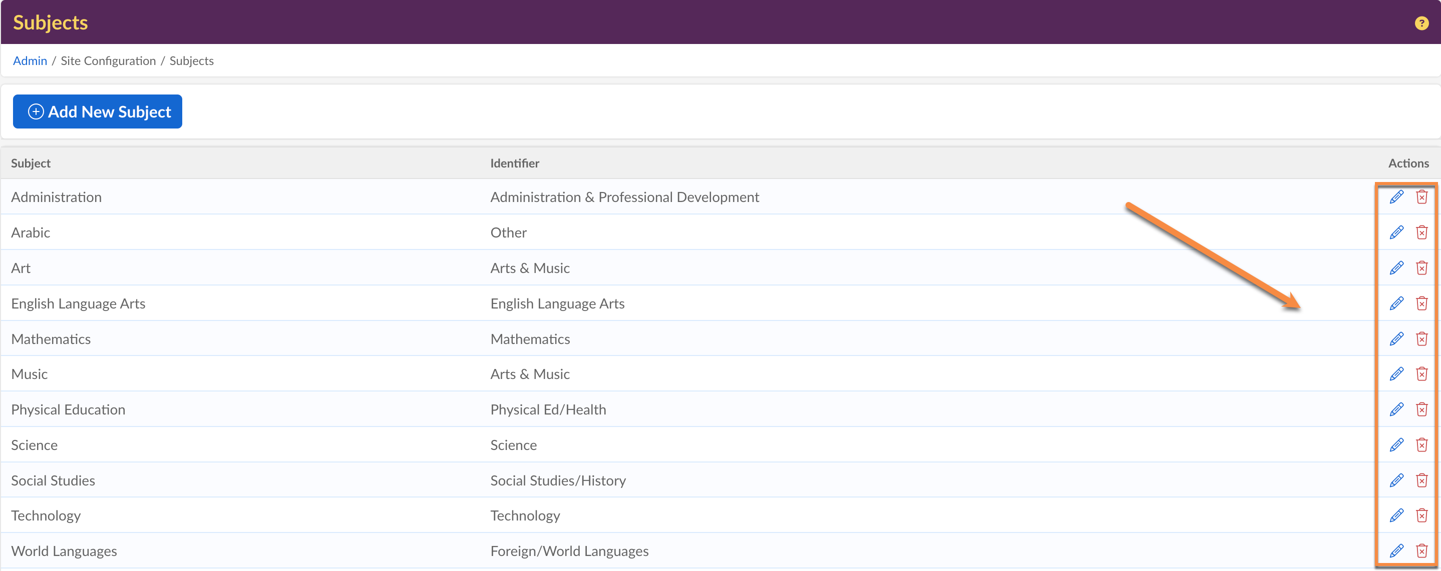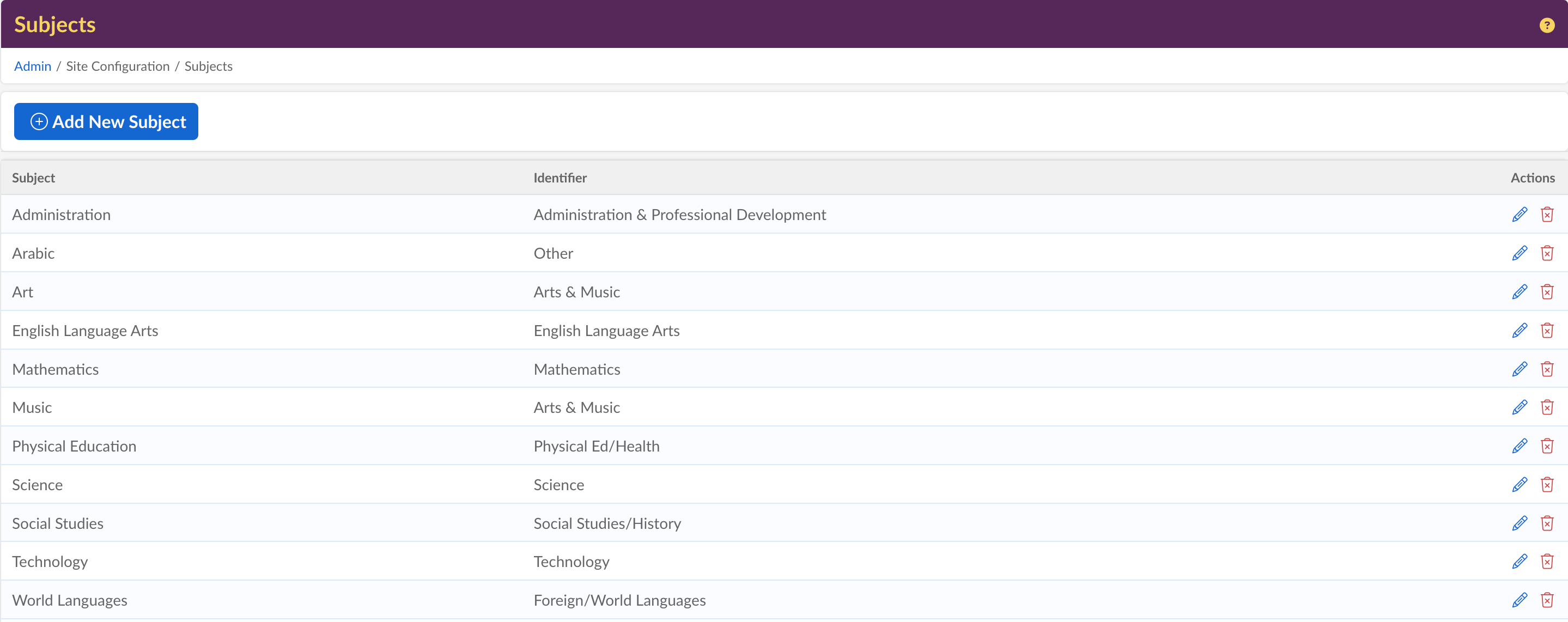 Initially, your Atlas has been set up with your school defined Subjects. However, as a System Admin, you can add, edit, and delete subjects that appear in the Atlas system via Admin > Admin Dashboard > Subjects.