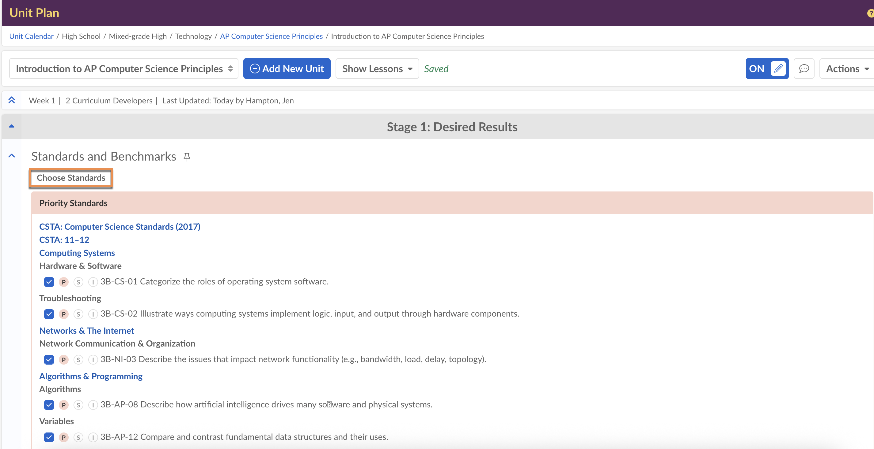 Flagged standards will show up like this in your unit planner: