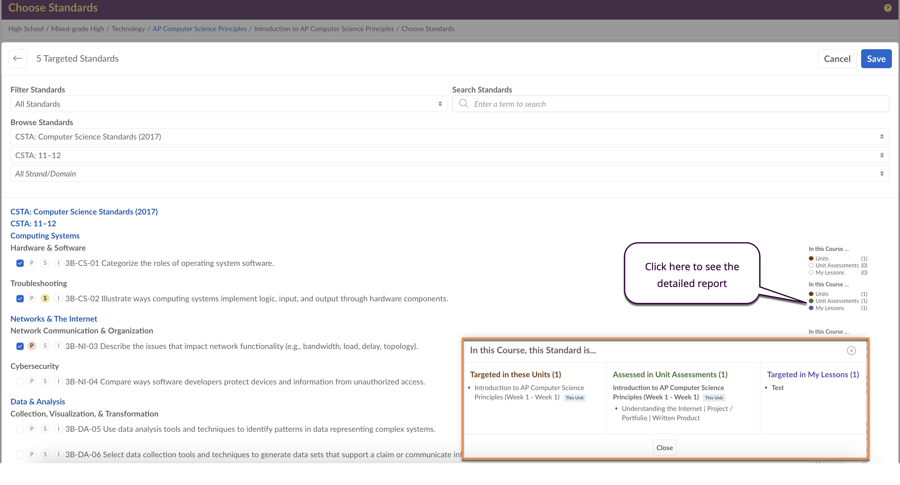 By clicking the Choose Standards button, you can specify the Subject, Grade, and Strand you desire. On the right side of the screen, you will notice an in-line report. When you mark a standard as targeted, the system will keep track of how many times that particular standard has been targeted within the course, across Units, Assessments, and Lessons.