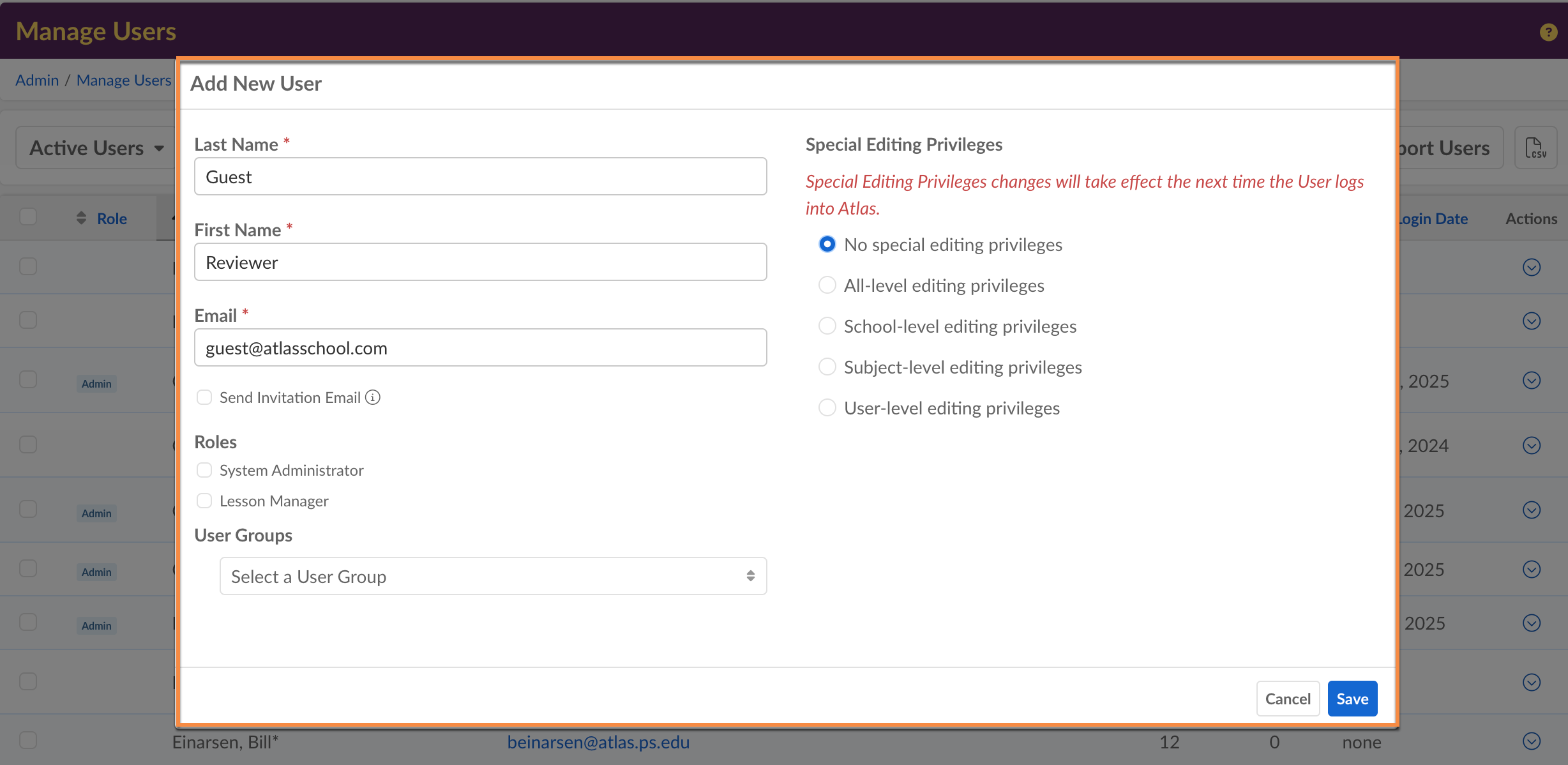 You can add a guest account (such as for an accreditation visit) in Atlas for a curriculum review team, and supply them with custom Atlas Reports that highlight your school’s curriculum strengths. All reviewers can access the same account simultaneously, so you only need one guest account for multiple users.