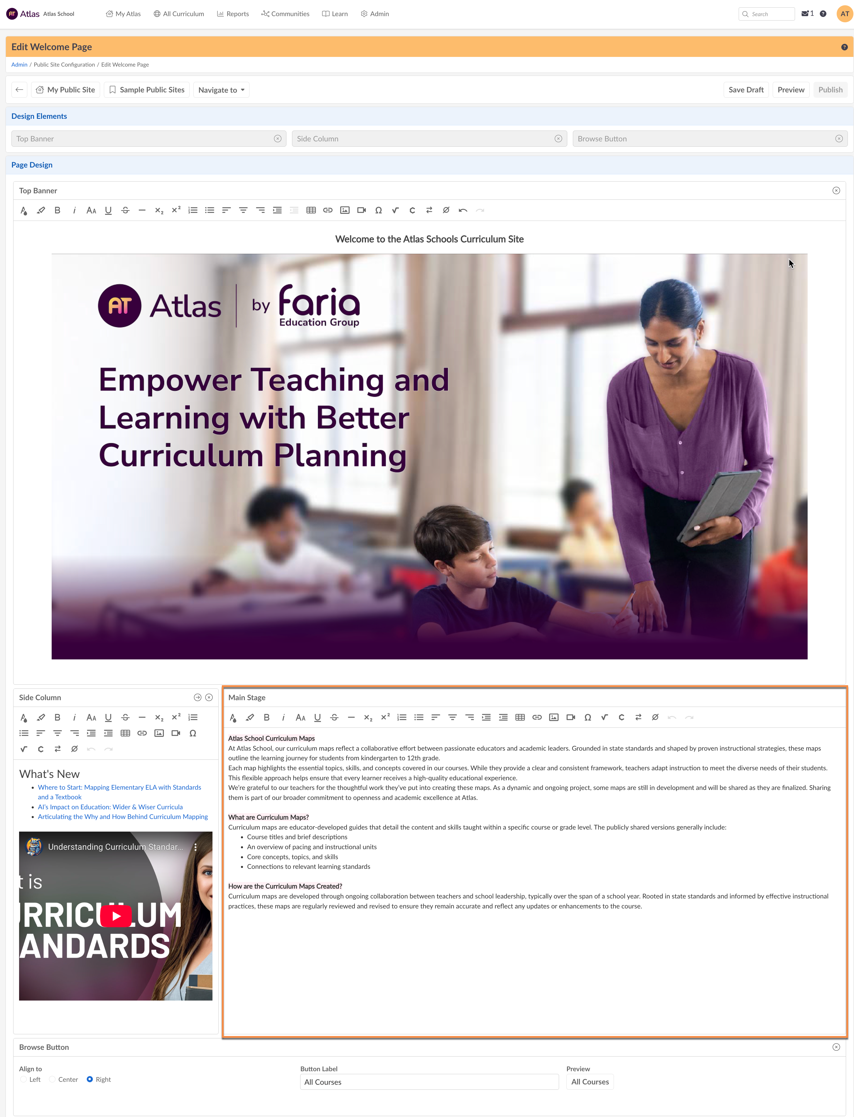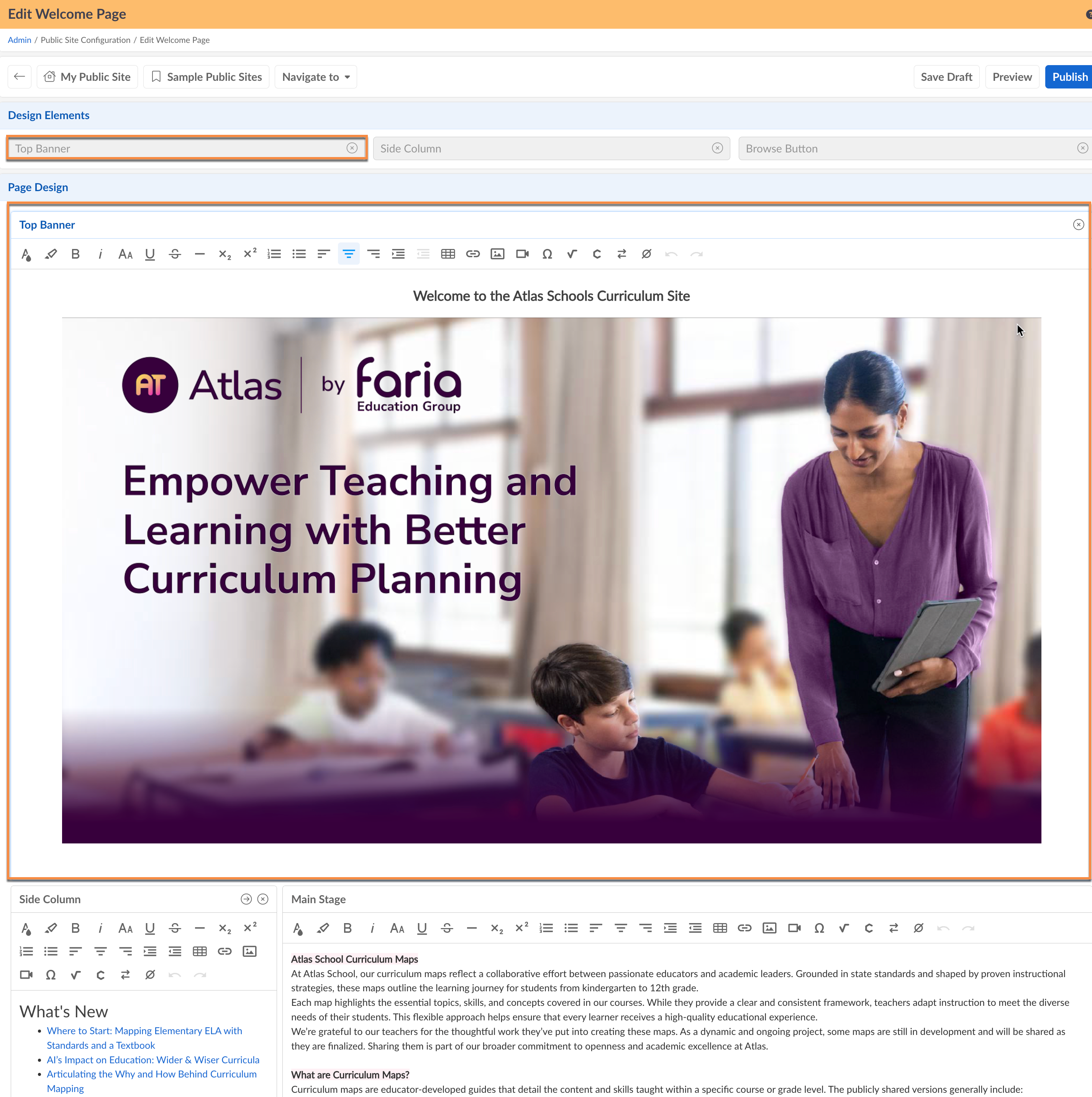 Admins can edit the Welcome Page of their Atlas Public Site via Admin > Admin Dashboard > Edit Welcome page. Contact your Atlas Account Manager or Atlas Support team for more information on building an Atlas Public Site to share with parents, board members, or community.
