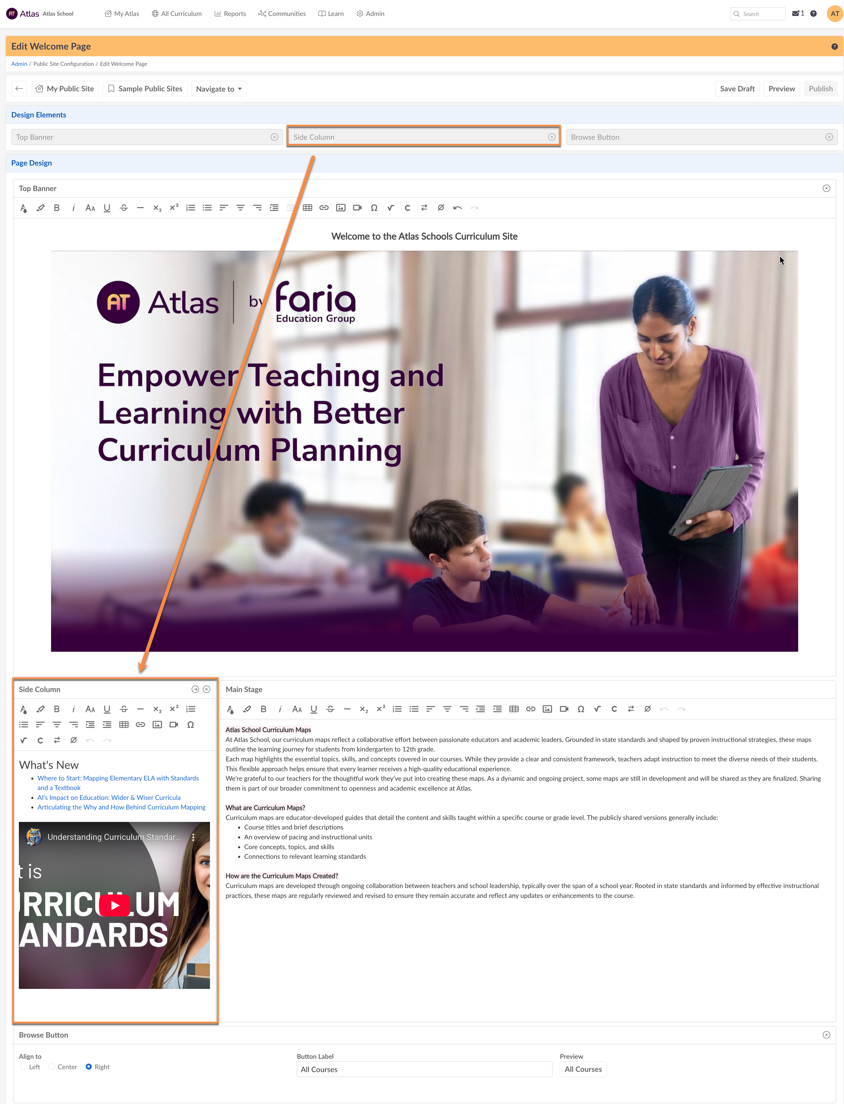 - The Side Column section is a rich text editor with many formatting options: